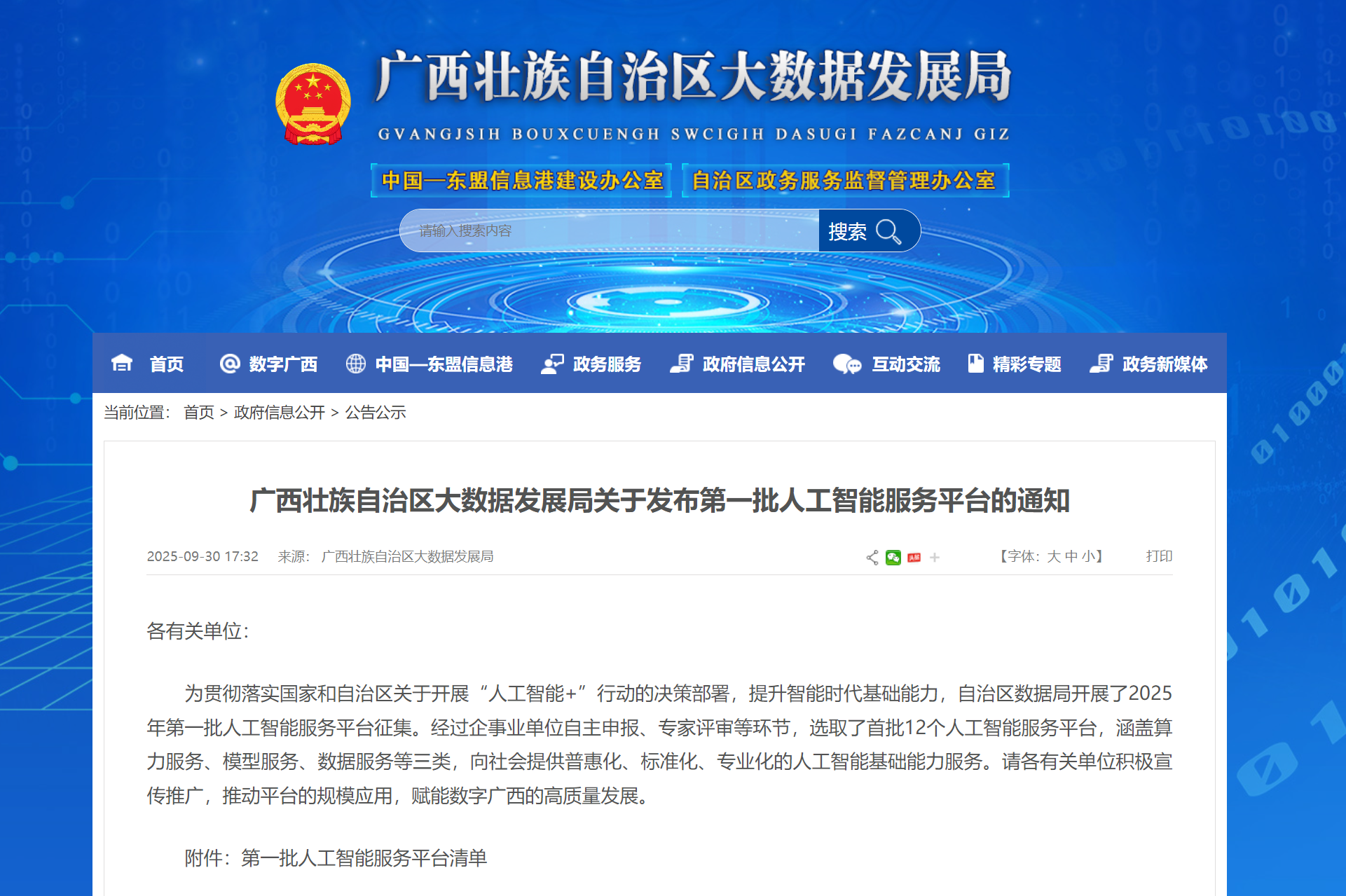北部灣大數(shù)據(jù)交易中心成功入選廣西首批人工智能服務(wù)平臺(tái)名單 2025-10-10